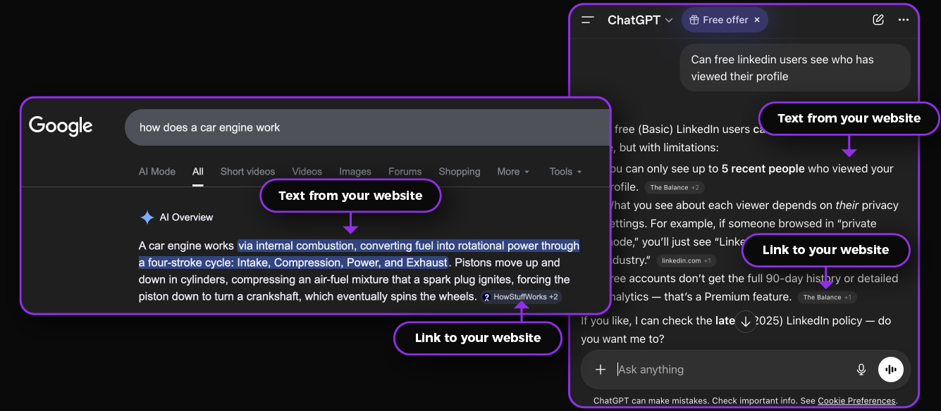 AI platforms like ChatGPT search the web for information, they then attribute that information to the website they sourced it from and show the user a link to the website. This could be your website. If your website is poorly optimized, the AI may have a hard time navigating your content and end up showing the user faulty or poorly formatted information. As this would be attributed to your website, this may impact your reputation.